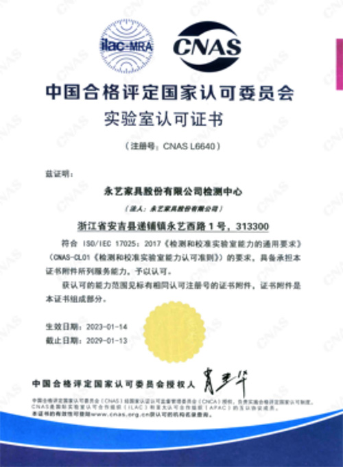 永藝實驗室是目前座椅行業(yè)規(guī)模最大、檢測設備最齊全的企業(yè)檢測機構,并獲得國家CNAS認證的檢測和校準實驗室認可,同時是國際權威測試機構德國萊茵TUV集團制造商現(xiàn)場測試實驗室。